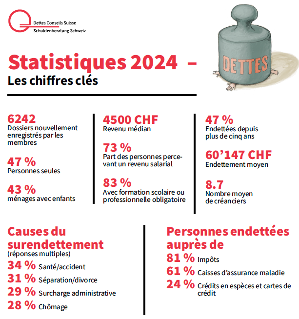 En Suisse, le surendettement reste synonyme d’exclusion sociale et économique à vie pour de nombreuses personnes concernées. C’est ce que révèlent les nouvelles statistiques 2024 : l’année dernière, 6 242 ménages ont sollicité une aide pour la première fois, parmi lesquels un nombre particulièrement élevé de personnes seules et de familles avec enfants. Dettes Conseils Suisse demande aux responsables politiques de mettre en place une procédure efficace d’assainissement  des dettes.